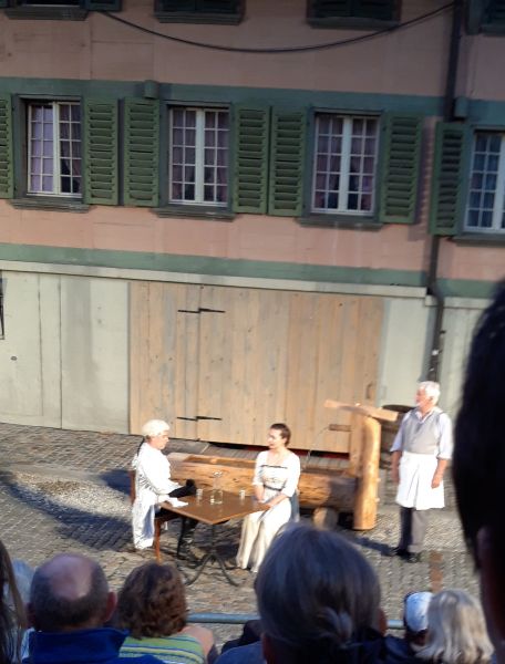 keinen Abbruch tat. Es wurde Eingekehrt und bei Kaffee und Dessert hatte man sich viel zu erzählen.Alle 60 Theaterbesucher nahmen am Sonntagabend 7. August den Weg noch einmal auf sich um
