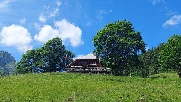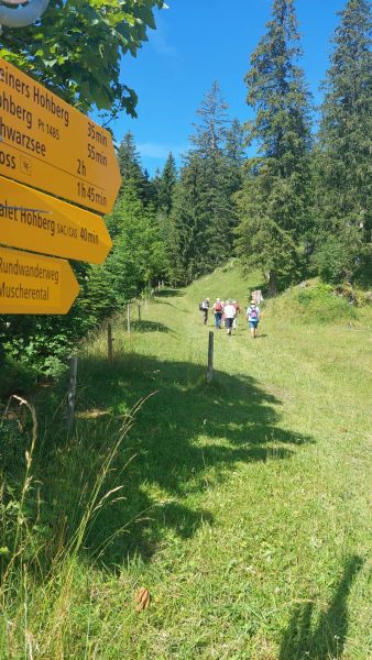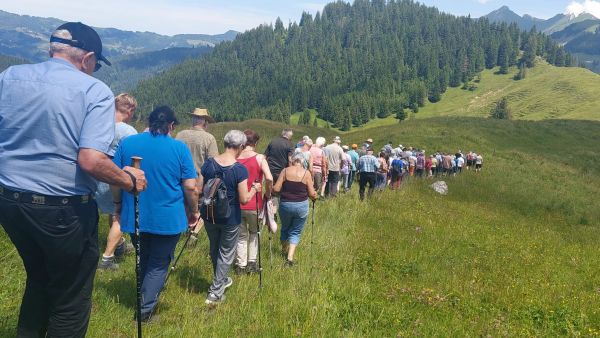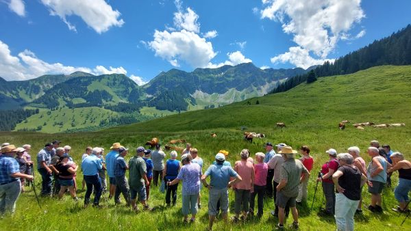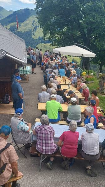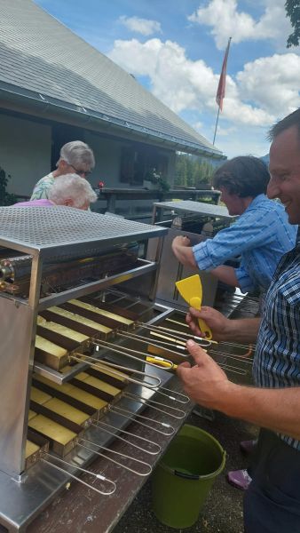 Strahlender Sonnenschein und eine Aussicht, die es in sich hatte. «Prachts-Wätter » würde die Berner Bäuerin sagen. Das bot sich uns, als wir uns in Scharen die kurvigen Bergstrassen hinaufschlängelten in Richtung Schönenboden oberhalb von Sangernboden zur Alp Steiners Hohberg. Man fuhr bis zur Alphütte oder wanderte vom Parkplatz aus ca. 40 Minuten die Alpweiden hoch. Schliesslich wartete ein währschaftes Älpler-Zmittag auf uns, und das wollte sich manch einer zuerst verdienen. Bei der Hütte empfing uns eine gut gelaunte Familie Stucki mit ihren Helferlein. Bevor sich die schwatzende und fröhliche Meute auf das Raclettebuffet stürzen konnte, gab es eine kleine Ansprache von unserem Präsi Martin Meier und anschliessend stellte uns Christian Stucki ihre Alp und den Talbetrieb in Uebeschi vor. Zusammen mit seiner Frau Barbara und den inzwischen erwachsenen Kindern gehen sie seit 22 Jahren hier z Alp, melken Kühe und Ziegen und stellen daraus feinen Käse her. Nach den spannenden Erläuterungen durfte man sich Tisch für Tisch den Teller mit Kartoffeln, Gürkli, Ziebeli und einem Stück Ananas füllen lassen, um am Schluss alles mit einer doppelten Portion Raclett-Käse abzuschmecken. Mit vollen Bäuchen begleiteten wir den Älpler Christian nach dem Essen auf eine kleine Rundwanderung um seine Alp, wo man nochmals die Aussicht geniessen oder die schönen Milchkühe bestaunen konnte, welche sich auf der saftigen Alpweide räkelten. Mit Kaffee und feinem Nidle-Chueche wurde der gelungene Tag abgerundet, und manch einen verschlug es noch in die Käsekammer, wo man sich mit Mutschli, Alp- oder Ziegenkäse eindecken konnte, um den Duft der Alpwiesen und die Erinnerung an den schönen Tag mit nach Hause nehmen zu können.