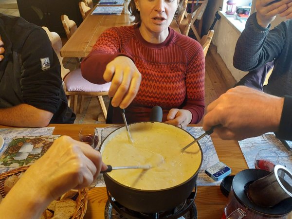 Im typischen Jura-Restaurant wurde uns ein crèmiges Fondue serviert und wir genossen die gemütliche Stimmung. Gut gelaunt marschierten wir zurück zum Ausgangspunkt.
